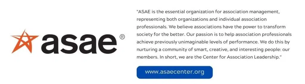 “ASAE is the essential organization for association management, representing both organizations and individual association professionals. We believe associations have the power to transform society for the better. Our passion is to help association professionals achieve previously unimaginable levels of performance. We do this by nurturing a community of smart, creative, and interesting people: our members. In short, we are the Center for Association Leadership.”