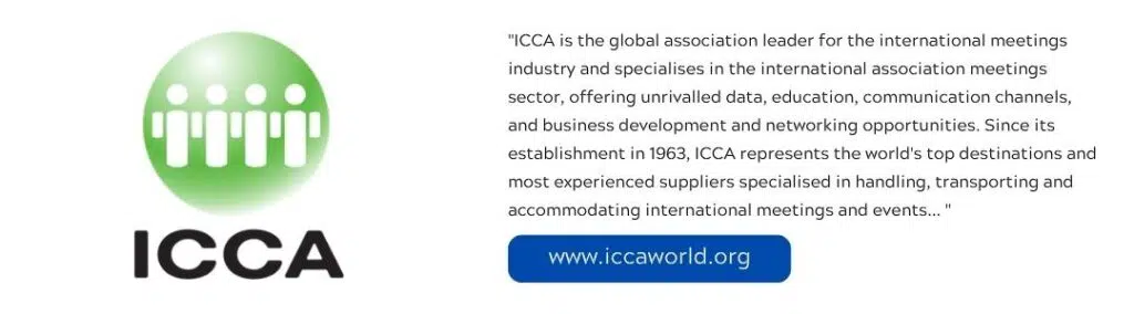 “ICCA is the global association leader for the international meetings industry and specialises in the international association meetings sector, offering unrivalled data, education, communication channels, and business development and networking opportunities. Since its establishment in 1963, ICCA represents the world’s top destinations and most experienced suppliers specialised in handling, transporting and accommodating international meetings and events… “